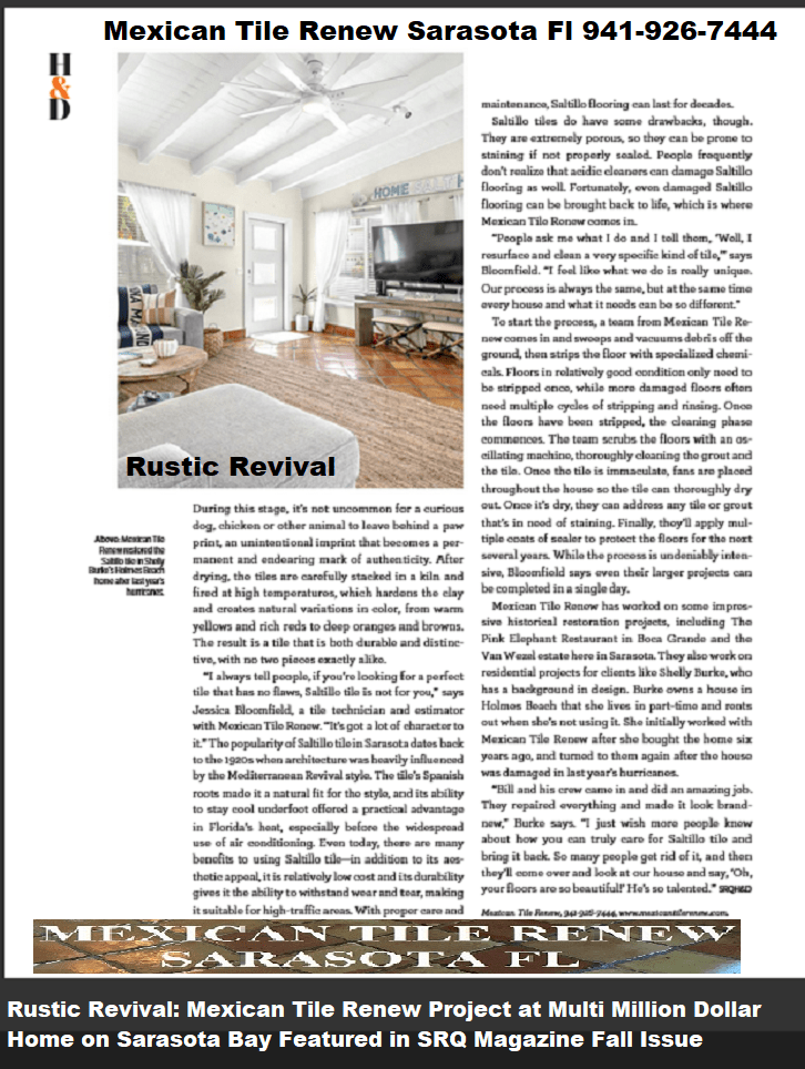 Mexican Tile Floors Were The Only Type of Flooring To Survive Hurricanes Helene and Milton Flooding in Southwest Florida. We make like new the good, the bad, and the just plain ugly worn out Saltillo tile floors. MEXICAN TILE RENEW: Clean Mexican – Saltillo Tile |Seal Mexican – Saltillo Tile |Restore Mexican Tile Sarasota Fl. ‘Mexican Tile Renew’ (941) 926-7444., Sarasota, FL 34233 a woman co-owned business for over 30 years, see our website at http://www.mexicantilerenew.com