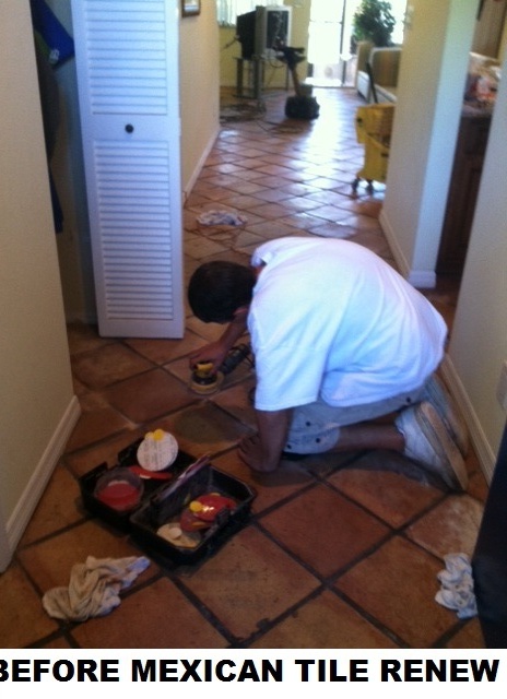 Mexican Tile Renew of 20 Year Old Floor in Condo At Harbourside Longboat Key Florida that had uneven corners sticking up everywhere and had not been re-finished in many many years. This particular Mexican tile renew project was very difficult, the tile had been very poorly installed 20 years ago with corners sticking up, un-leveled tiles and had many layers of dirty wax/sealer.