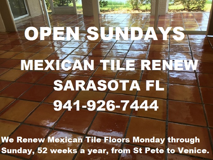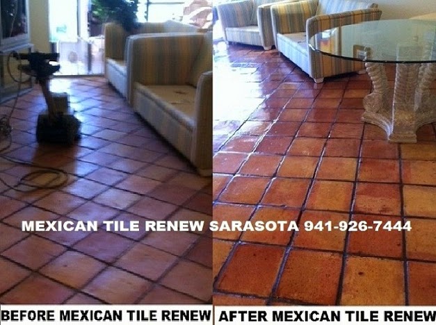 I called Mexican Tile Renew to take care of a pool deck area that leads to a kitchen and laundry area in a house that had not been cleaned and sealed in many years. My wife and I took over a foreclosed home in the Gulf Gate area of Sarasota Fl and we needed to get the home ready for sale, as it stood, the Mexican Tile was a big distraction with old rubber pad stuck to the Mexican tile in areas of the kitchen where mats had been laying and the pool area tile was covered with black mold and all marked up. Bill and his crew from Mexican Tile Renew showed up at 8:30 am and proceeded to strip off all the old sealer, rubber padding and removed all the mold, they cleaned and sanded tiles as needed and put on 4 coats of a clear sealer that made the Mexican tiles come alive, very good job. We were able to sell the house within 10 days, thanks Mexican Tile Renew .