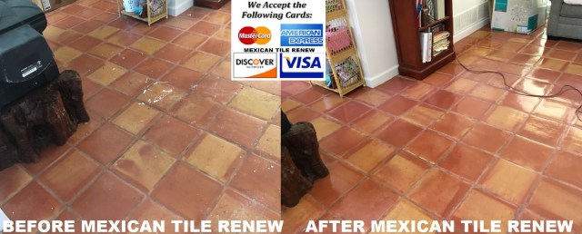 MEXICAN TILE RENEW PROJECT ON LIDO BEACH FL WHERE PAINT HAD BEEN SPILLED ON FLOOR. Mexican Tile Renew services Sarasota County & Manatee County and has since 1995 CALL 941-926-7444. Mexican Tile Restoration – Saltillo Tile Restoration
