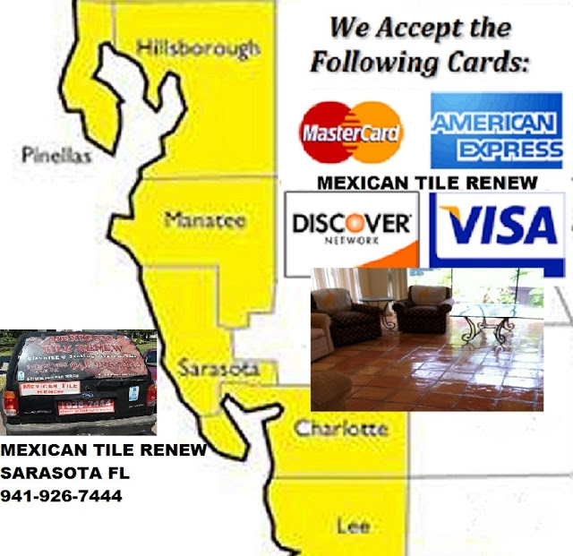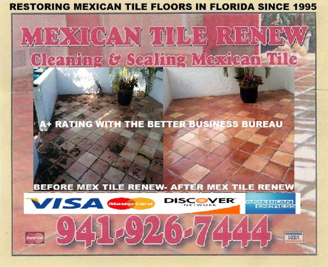 Since January 1995 Mexican Tile Renew has been cleaning and sealing Mexican Tile floors indoors and out all over South West Florida, we are based in Sarasota Fl, call Vel at 941-926-7444 for pricing. email mexicantilerenew@aol.com