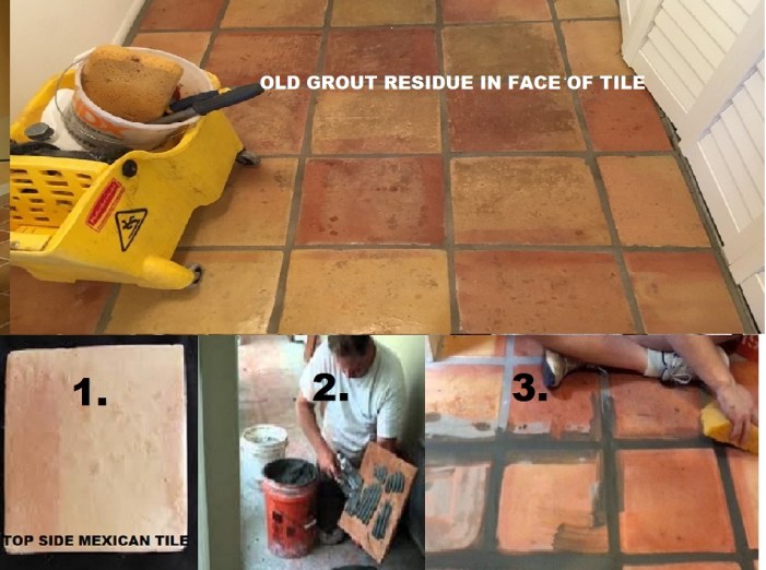 CLICK ON IMAGE TO ENLARGE: Mexican Tile Renew Project on Longboat Key Fl Where Black Grout Residue Had Not Been Cleaned Off Tile Before Sealing. GROUTING MEXICAN TILE When the water dries, minerals remain on the tile surface. Residual grout haze is a normal part of tiling; because grouting involves smearing grout across the tile with a rubber float, the tile is entirely covered with grout at some point and must be removed prior to sealing.