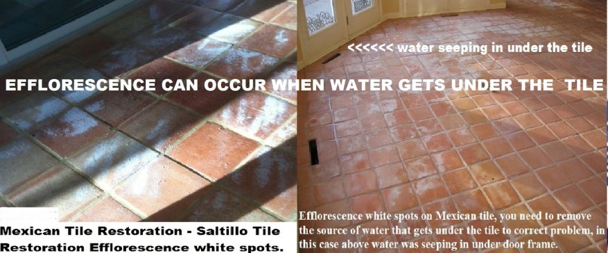 The formation of these salt deposits are not mysteries. They are, for the most part, water-soluble salts that come from many possible sources to mar and detract from an otherwise beautiful and serviceable structure. First of all, there must be water present to dissolve and transport the salts, remove the source of water and your almost there. Efflorescence, the white spots, that forms on the exterior Mexican tile of the patio in photo above. Naturally, Saltillo tile is not terribly strong or hard. Although it is comparable to other natural stone tiles such as slate or granite it can chip and crack.