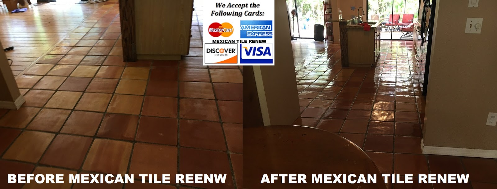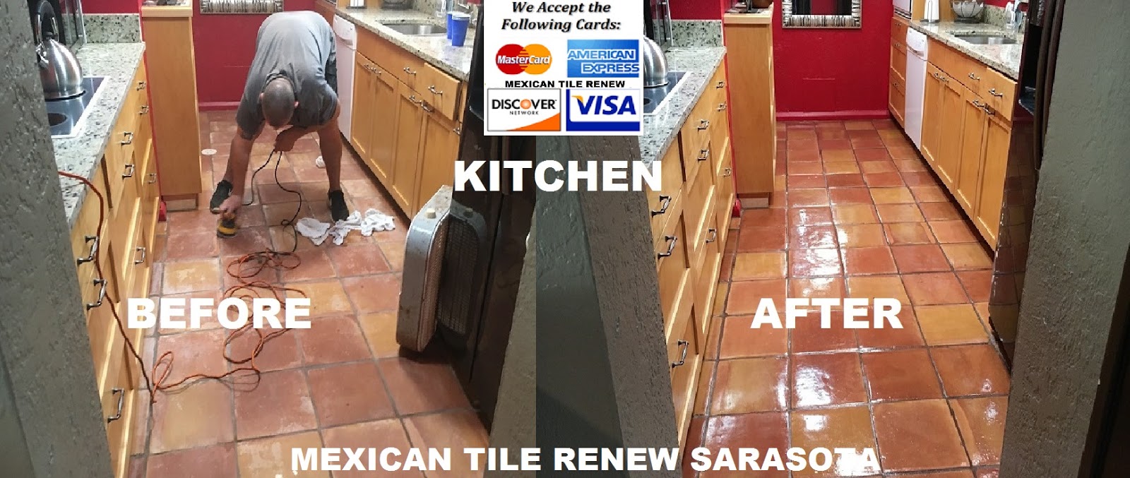 Recent Mexican Tile Renew Projects of Completed Refinishing of Kitchen Tile Floors in Sarasota Fl. Mexican tile once placed, it stains and scuffs easily if not properly sealed and maintained with a quality sealant.