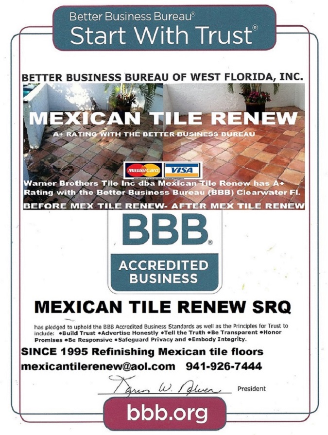 MEXICAN TILE RENEW: Clean Mexican-Saltillo Tile |Seal Mexican-Saltillo Tile |Restore Mexican Tile Sarasota Fl Better Business Bureau Approved. Mexican Tile Renew For Over 25 Years Has A+ Better Business Bureau (BBB) Rating. CALL 941-926-7444, email mexicantilerenew@aol.com