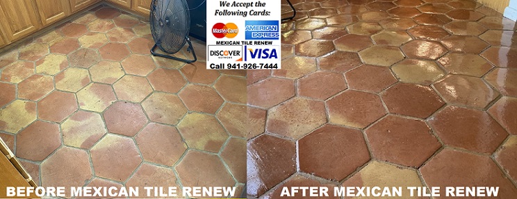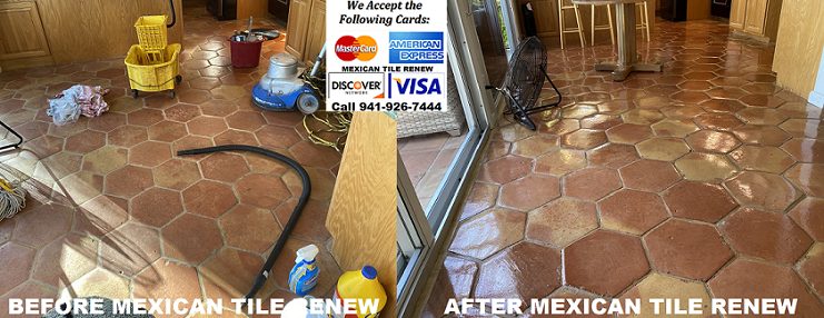 Mexican Tile Renew Project on Long Boat Key With 30 Year Old Saltillo Tile. Saltillo tile (sometimes referred to as Mexican tile) is durable, but over time it can become worn out or stained. You can refinish Saltillo floors in the Sarasota area with Mexican Tile Renew. Better Call “Vel” at Mexican Tile Renew Sarasota Fl 941-926-7444.
