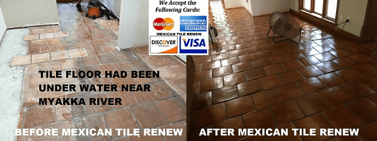 Mexican Tile Floors Flooded by Hurricane Ian Can Be Stripped and Resealed to Like New Appearance. Before and after photos above are from a house that was near the Myakka river in Florida when the river overflowed it’s banks. The tile floor has to totally dry out before any work can begin. Call Vel at 941-926-7444