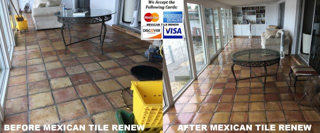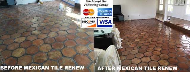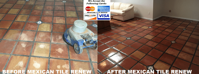Don’t make a big mistake and tear out old Mexican tile at $12.00 to $13.00 per square foot and endure clouds of dust and debris for weeks, Renew Mex Tile Don’t Replace.