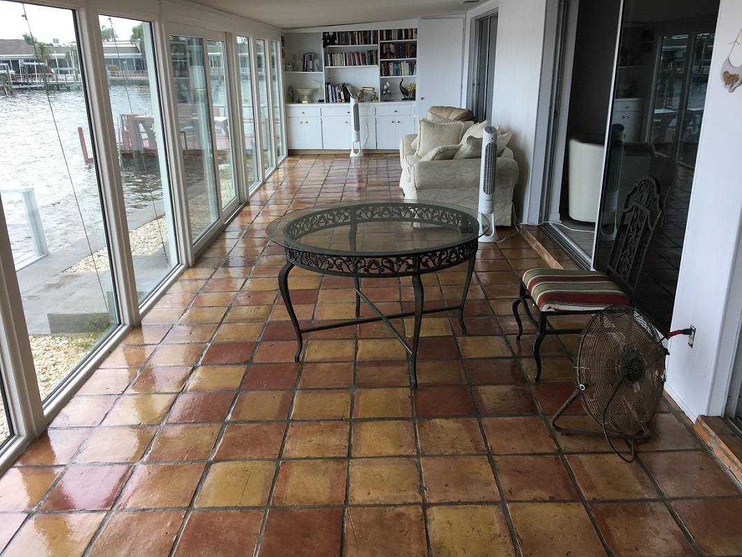 Mexican Tile Floors flooded by Hurricanes Helene and Milton can be stripped, cleaned and resealed to like new appearance in 20 days, after floor dried out with fans and A/C on. The flood water got under the Mexican tile, it takes time to dry out the tile and the concrete slab. Before and after photos above are from a house that was near the Myakka river in Florida when the river overflowed it’s banks. The tile floor has to totally dry out before any work can begin.