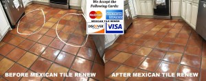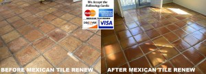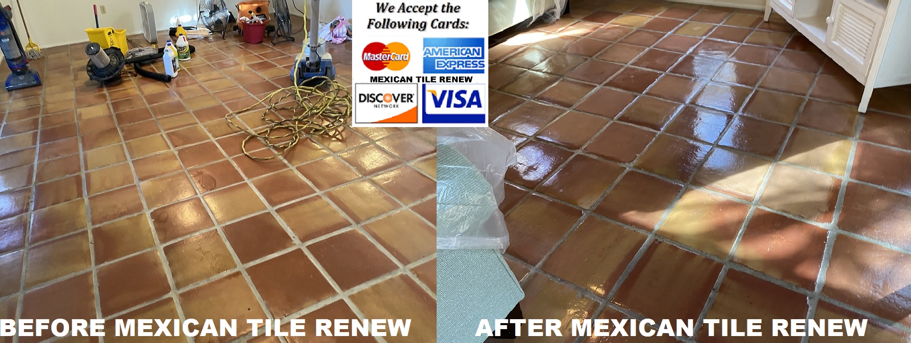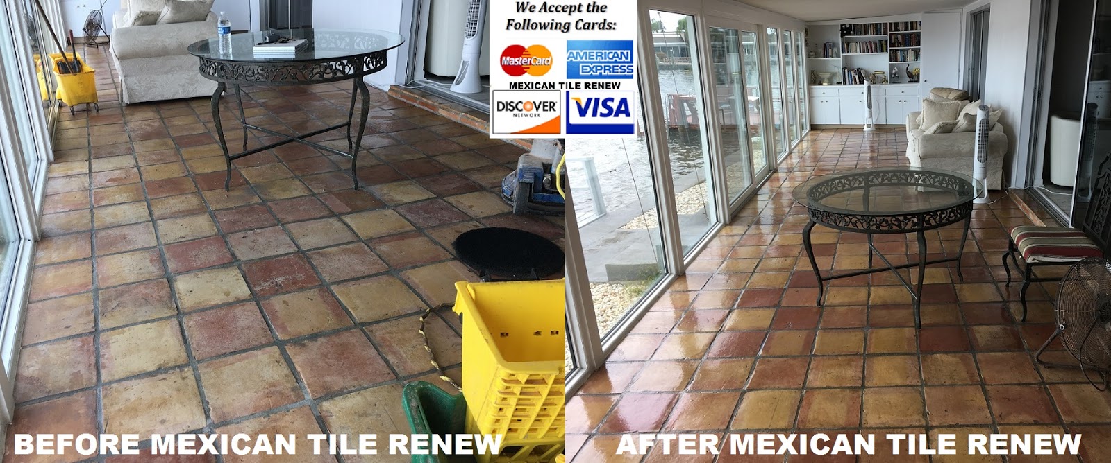 I called Mexican Tile Renew to take care of a pool deck area that leads to a kitchen and laundry area in a house that had not been cleaned and sealed in many years. My wife and I took over a foreclosed home in the Gulf Gate area of Sarasota Fl and we needed to get the home ready for sale, as it stood, the Mexican Tile was a big distraction with old rubber pad stuck to the Mexican tile in areas of the kitchen where mats had been laying and the pool area tile was covered with black mold and all marked up. Bill and his crew from Mexican Tile Renew showed up at 8:30 am and proceeded to strip off all the old sealer, rubber padding and removed all the mold, they cleaned and put on 4 coats of a clear sealer that made the Mexican tiles come alive, very good job. We were able to sell the house within 10 days, thanks Mexican Tile Renew.