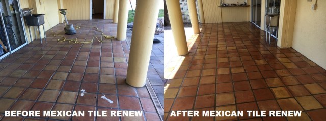 MEXICAN TILE RENEW PROJECT AT UPSCALE HOME ON THE WATER SIESTA KEY FL. Mexican Tile, also known as Saltillo tile, is a very porous clay tile that requires special cleaning and sealing techniques. Mexican Tile Renew in Sarasota will strip off old sealers, clean the tile, and reseal to a like new appearance.