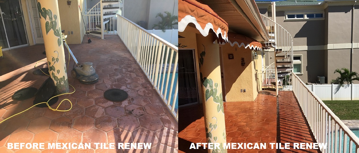 MEXICAN TILE RENEW PROJECT AT UPSCALE HOME ON THE WATER SIESTA KEY FL. Mexican Tile, also known as Saltillo tile, is a very porous clay tile that requires special cleaning and sealing techniques. Mexican Tile Renew in Sarasota will strip off old sealers, clean the tile, and reseal to a like new appearance.