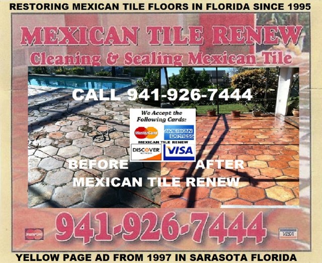 We have been in the Flooring and Tile business for over 25 years in Sarasota Fl, Better Call “Vel” at 941-926-7444. Mexican Tile Renew has an A+ rating with the Better business Bureau. Mexican Tile Cleaning and Sealing “Mexican Tile Renew” CALL TOLL FREE 866-926-7444 or 941-926-7444 Email Vel: mexicantilerenew@aol.com WE ACCEPT ALL MAJOR CREDIT CARDS.