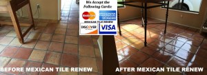 Most Mexican tile renew projects are a one day endeavor. Our one and only job is to refinish your Mexican tile floor to a like new appearance. It aids in getting the project completed in a timely manner if furniture is removed from the work area and the A/C is kept at 70 degrees during the process to facilitate the drying of the tiles and the different costs of sealer. We Make Like New Your Saltillo Tile Floors, The Good, The Bad and Just Plain Ugly Ones.