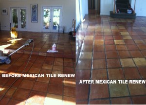 Mexican Tile Floor Care: Do Not use Vinegar to Clean Your Mexican Tile Floor it Will Ruin the Finish. Vinegar is an acid. Proper weekly maintenance is just as important as getting the right installer in order to extend the life of your Mexican Saltillo tile. “No Mop & Glo and no Endust, no Spic and Span.” Would you put any of these things on your car? Don’t use them on your Mexican tile. JUST USE SOAP AND WATER TO CLEAN YOUR TILE, SOAP LIKE DISHWASHER DETERGENT. BETTER CALL VEL AT MEXICAN TILE RENEW 941-926-7444