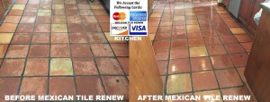Mexican Tile Renew Project on Siesta Key Fl With Old Style Saltillo Tiles With Chips and Half Moons on Edges. Mexican Tile Renew ACRYLIC SELAERS offers high gloss protection and beauty to unglazed Mexican paver tile and other porous terra cotta surfaces with fewer coats. A blend of the latest in acrylic polymer technology has been coupled with an antimar agent, U.V. inhibitors and a grease and oil blocker to become the perfect solution for sealing porous tile.
