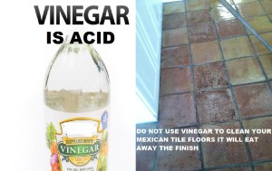 Never use vinegar to clean a Mexican Tile Floor, vinegar is an acid and will pit and destroy the finish on your Mexican Tile Floor.Vinegar is a liquid consisting of about 5–20% acetic acid (CH3COOH), water, and other trace chemicals. Vinegar is effective in removing clogs from drains. Vinegar also can help remove wallpaper and will eat away the finish on your Mexican tile floors. Mexican Tile Renew Clean and Seal Fort Myers to Sarasota To St Pete Fl. CALL VEL AT 941-926-7444. email mexicantilerenew@aol.com
